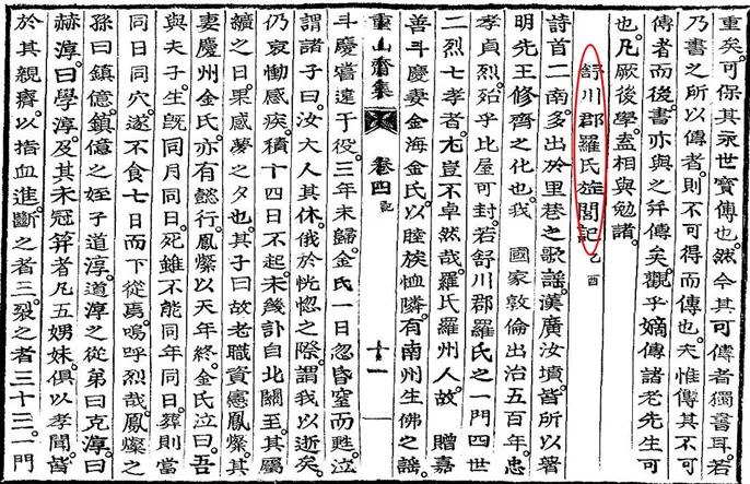 그중에 서천 나씨 가문은 4세대 동안 2열녀와 7효자가 났으니, 어찌 우뚝함이 되지 않으랴. 나씨는 나주 사람으로 고 증가선대부 두경의 처 김해김씨는 집안을 화목하게 하고, 이웃을 구휼하여 남방 고을에서 산부처님(생불)이라는 노래가 나왔다. 일찍이 두경은 멀리 요역에 가서 3년 동안 돌아오지 않은 적이 있었는데, 김씨는 어느 날 갑자기 까무러쳤다가 깨어나, 울면서 여러 아들에게 ‘너희들 아버지께서는 돌아가셨구나. 내가 갑자기 혼몽해진 즈음에 나에게 떠나갔다.’고 했다. 이에 슬프게 통곡하며 거의 14일 동안 일어나지 못했다. 부고가 북관에서 이르기도 전이다. 그 남편이 죽는 날이 꿈에 나타난 날의 저녁이었다. 그 아들은 고 노직 자헌대부 봉찬인데, 그 처 경주김씨 또한 기릴 만한 행위가 있었다. 봉찬은 천수를 다하고 죽었는데도 김씨는 울면서 말하기를, “나와 낭군은 이미 같은 날에 태어났다. 죽음은 비록 같은 날이 아니지만, 장례는 같은 날 한 구덩이에 묻히리라.”라고 한 뒤, 7일을 먹지 아니하고 하세했다. 오호라! 열렬하도다. 봉찬의 손자는 진억이다. 진억의 조카는 도순이다. 도순의 종제는 극순, 혁순, 학순이며 성인이 되지 못한 사람이 무려 5남매인데, 효성스럽기로 소문이 났다.