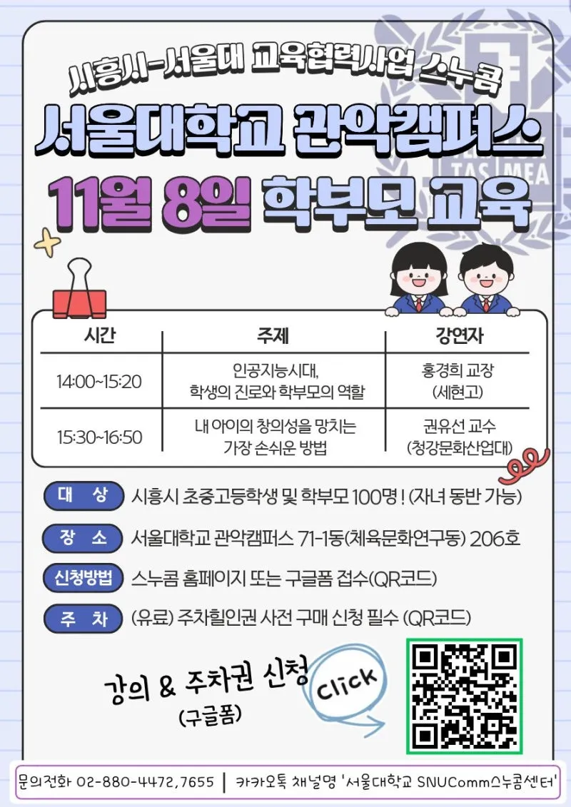 안녕하세요? 오는 11월과 12월, 스누콤 학부모특강이 서울대학교 관악캠퍼스(71-1동 206호)에서 열립니다. 모집대상은 시흥시 학부모 100명이며, 선착순으로 마감됩니다(구글폼+홈페이지 접수순) 아래의 모든 정보를 입력해야, 신청이 완료가 됩니다. 기입된 정보는 입장 확인용으로 활용되며, 정보 확인이 되지 않을 경우 입장이 제한될 수 있습니다. 또한 주차할인권이 필요하신 경우, 반드시 본 문서 하단의 **[주차할인권 신청]**를 통해 신청해 주시기 바랍니다(※ 기한 이후에는 주차권 구매가 불가능합니다) (스누콤 홈페이지에서 신청...