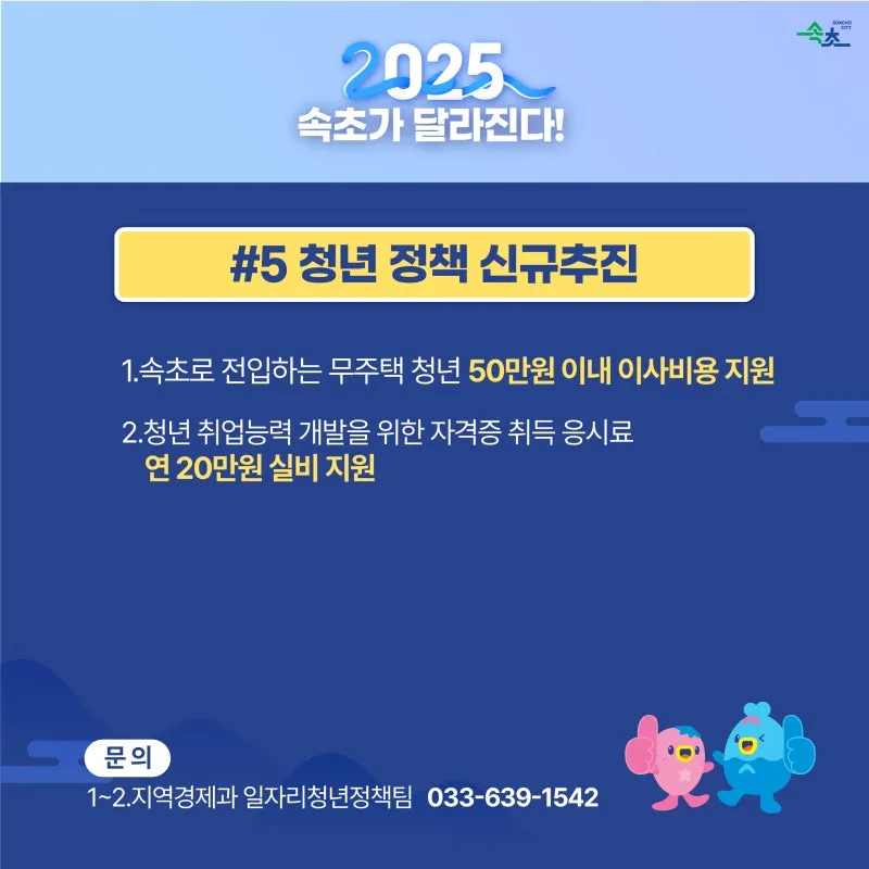 1.속초로 전입하는 무주택 청년 50만원 이내 이사비용 지원