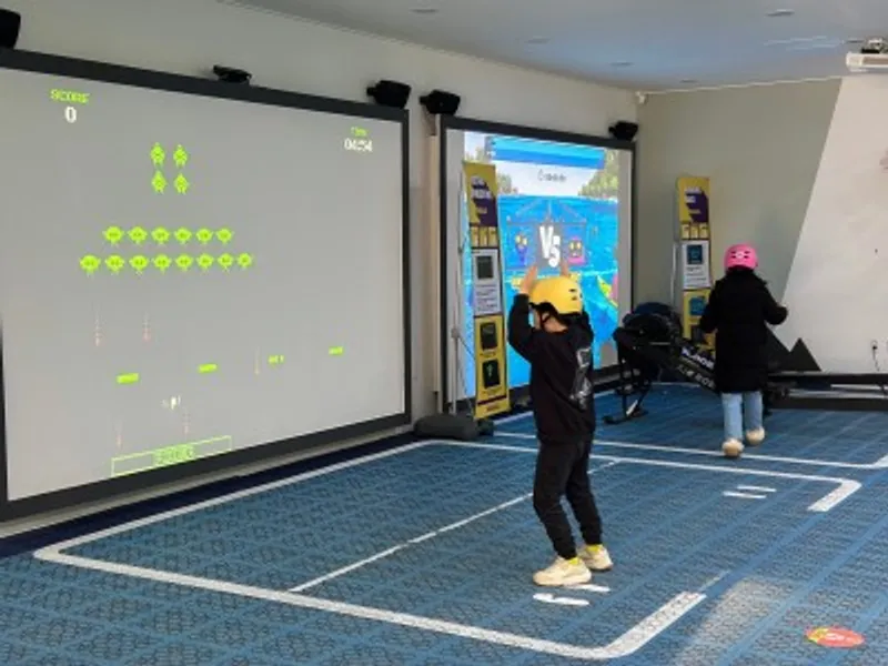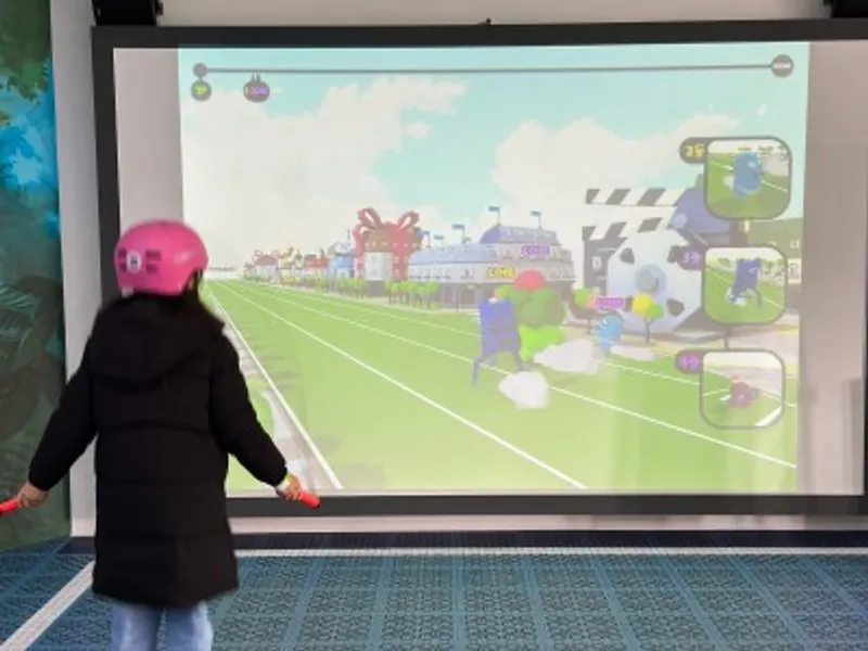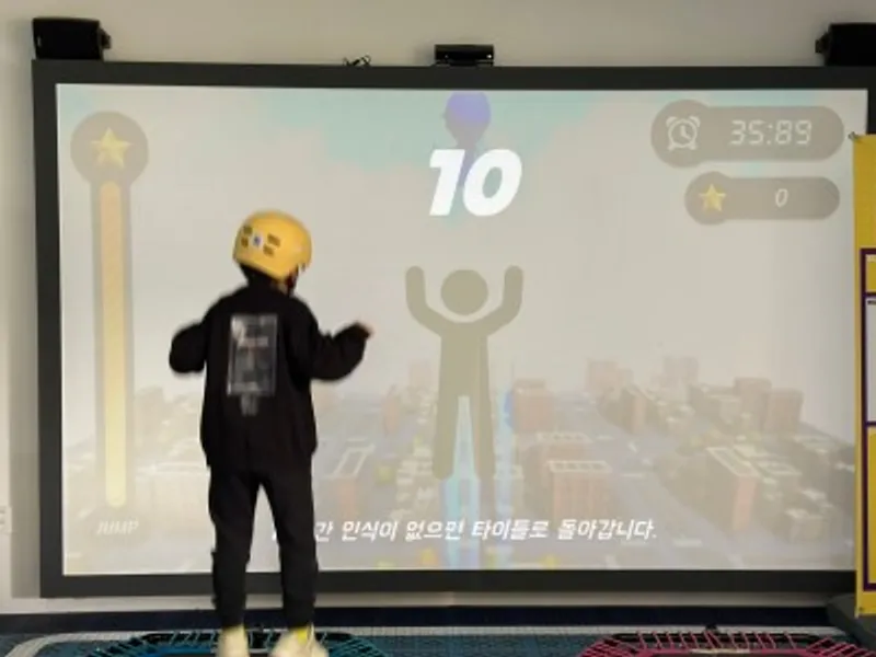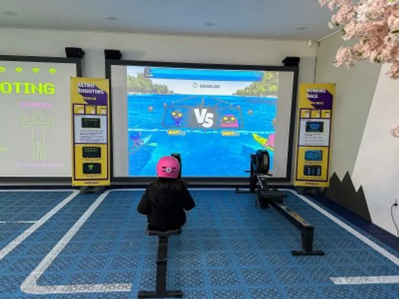 실내 인터렉티브 체험공간에는 로잉머신, 레트로슈팅, 점프로프, 트램풀린 등 4종의 영상체험 놀이를 할 수 있어요.
