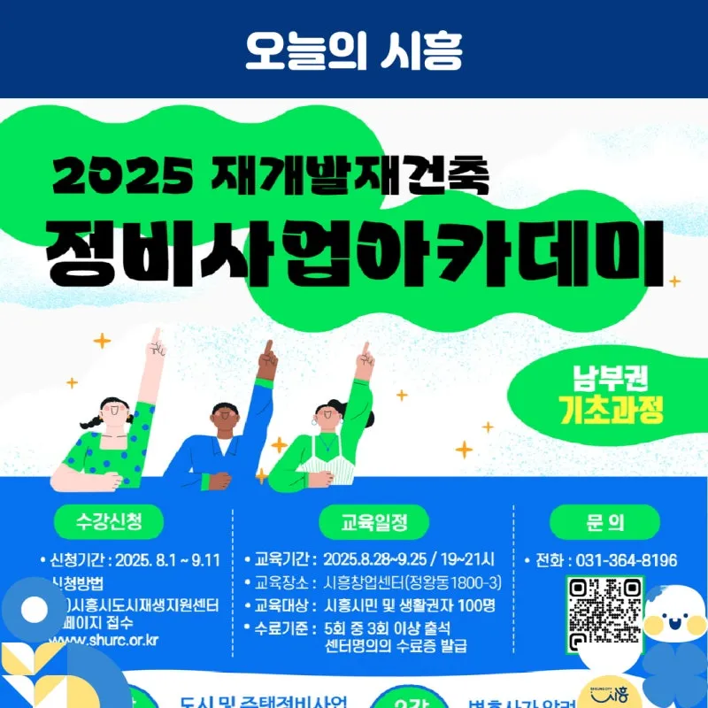 시흥시와 (재)시흥시도시재생지원센터는 ‘2025 시흥시 정비사업 아카데미ㆍ북부권’을 마치고, 오는 8월 28일부터 ‘남부권 기초과정’을 개설합니다.