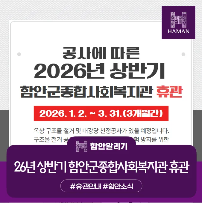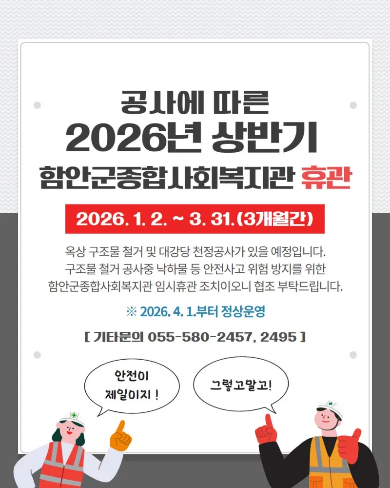 2026년도 상반기 함안군 종합사회복지관 공사로 인해 일정 기간 휴관합니다.