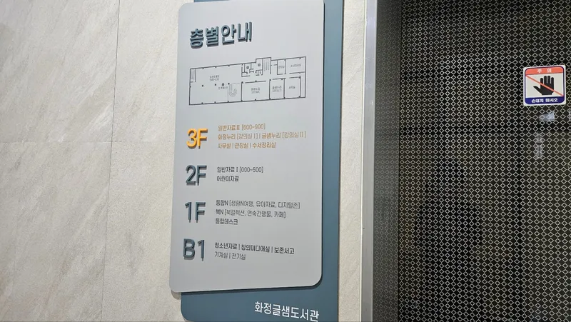 화정글샘도서관은 지하 1층부터 지상 3층까지 총 4층으로 이루어져 있으며