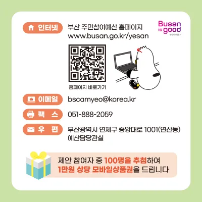 ✅참여방법: 홈페이지<www.busan.go.kr/yesan>, 이메일<bscamyeo@korea.kr>, 팩스<051-888-2059>, 우편<부산광역시 연제구 중앙대로 1001, 예산담당관>
