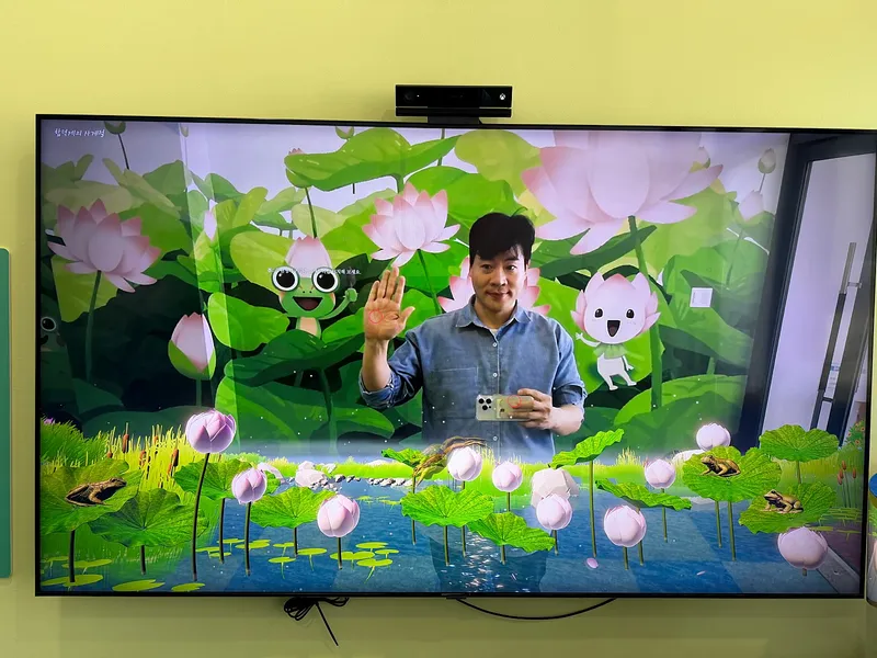 생태체험 AR 공간입니다. 화면을 보고 자신의 모습이 나타나면 화면에 등장하는 동식물들을 손으로 터치하는 체험인데요.
