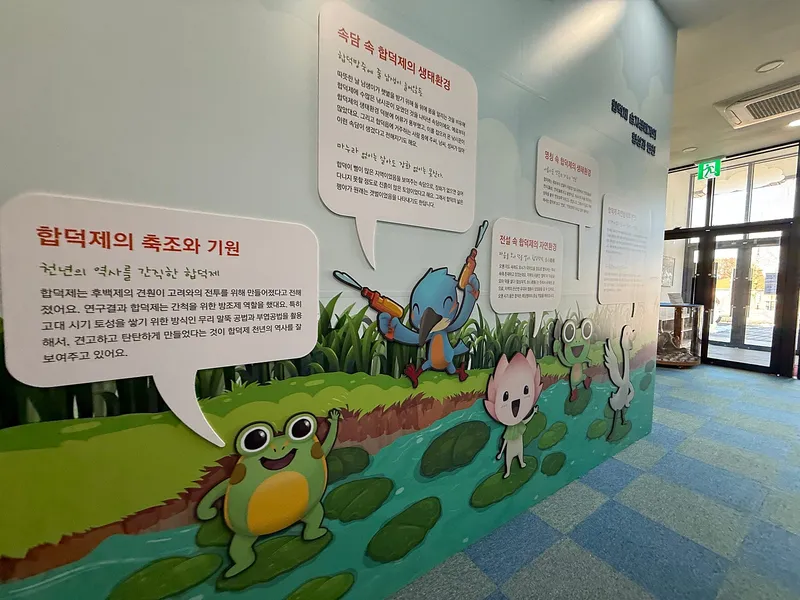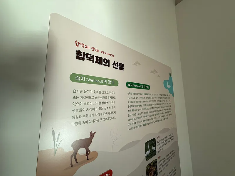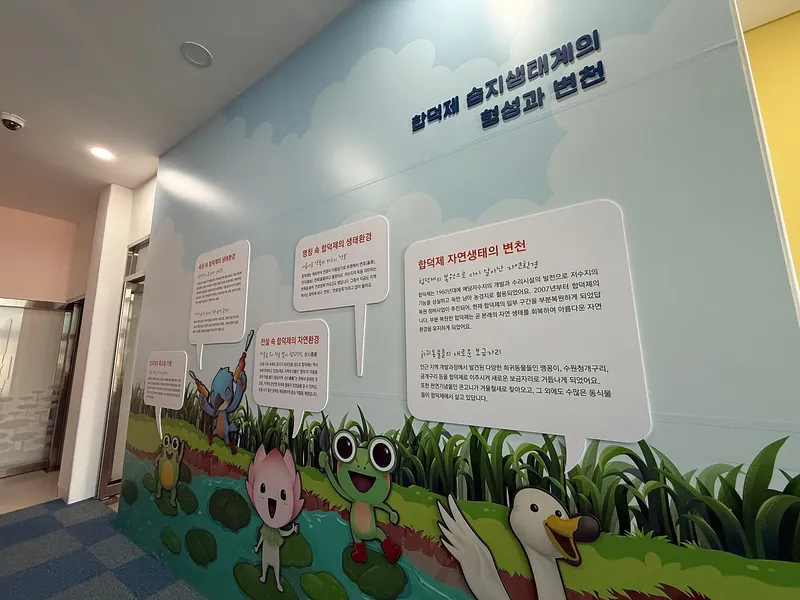 다음으로는 실감영상체험실과 가는 길 양옆 벽을 그래픽월로 꾸며 놓았습니다. 합덕제의 축조와 기원, 합덕제의 생태환경 등 합덕제와 관련된 다양한 정보들을 읽고 배울 수 있는 공간입니다.