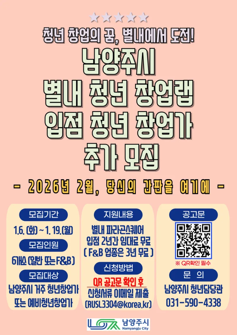 남양주시 별내 청년 창업랩 입점 청년 창업가 추가 모집(최대 3년간 임대료 지원)