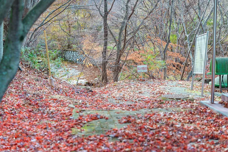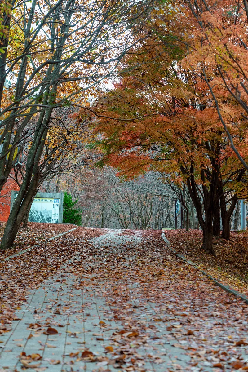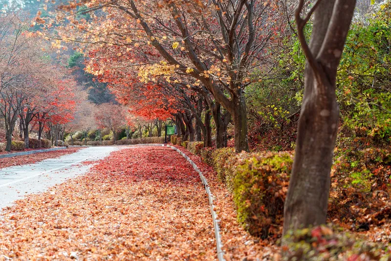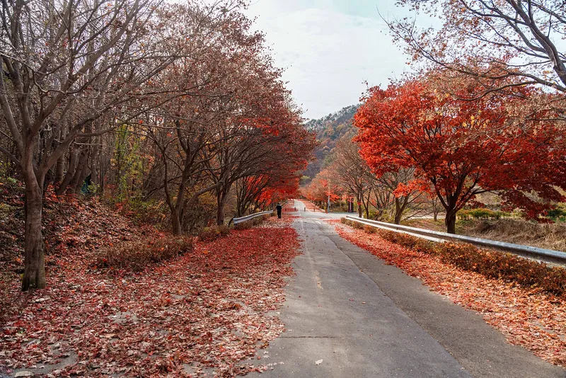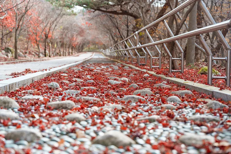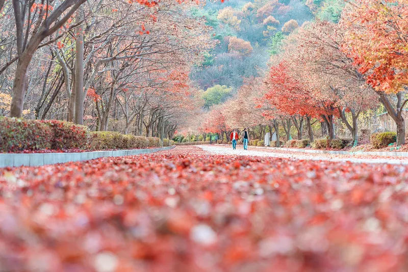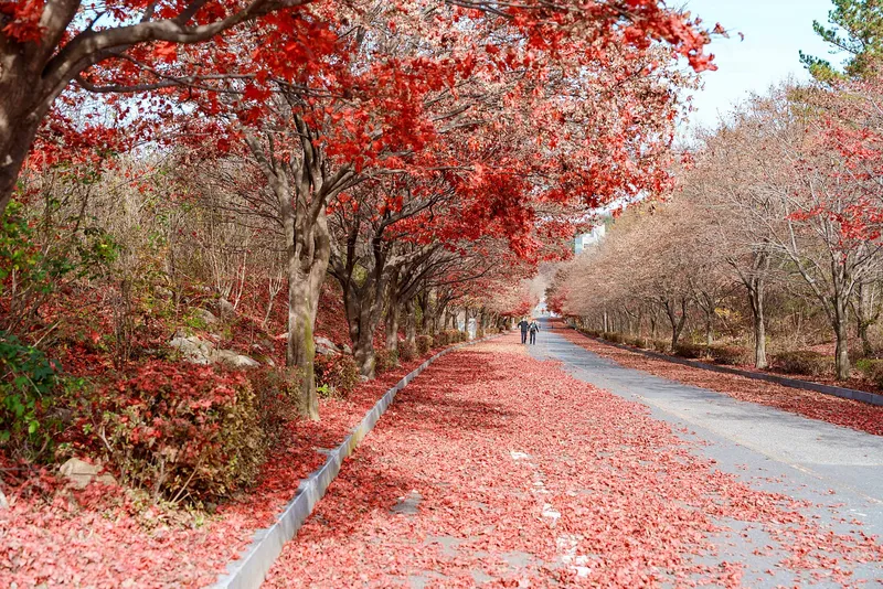 산책로를 중심으로 양쪽으로 위치한 단풍나무가 산책로를 더욱더 아름답게 빛내고 있습니다. 빨갛게 물든 단풍이 많은 사람들의 마음까지 설레게 합니다.