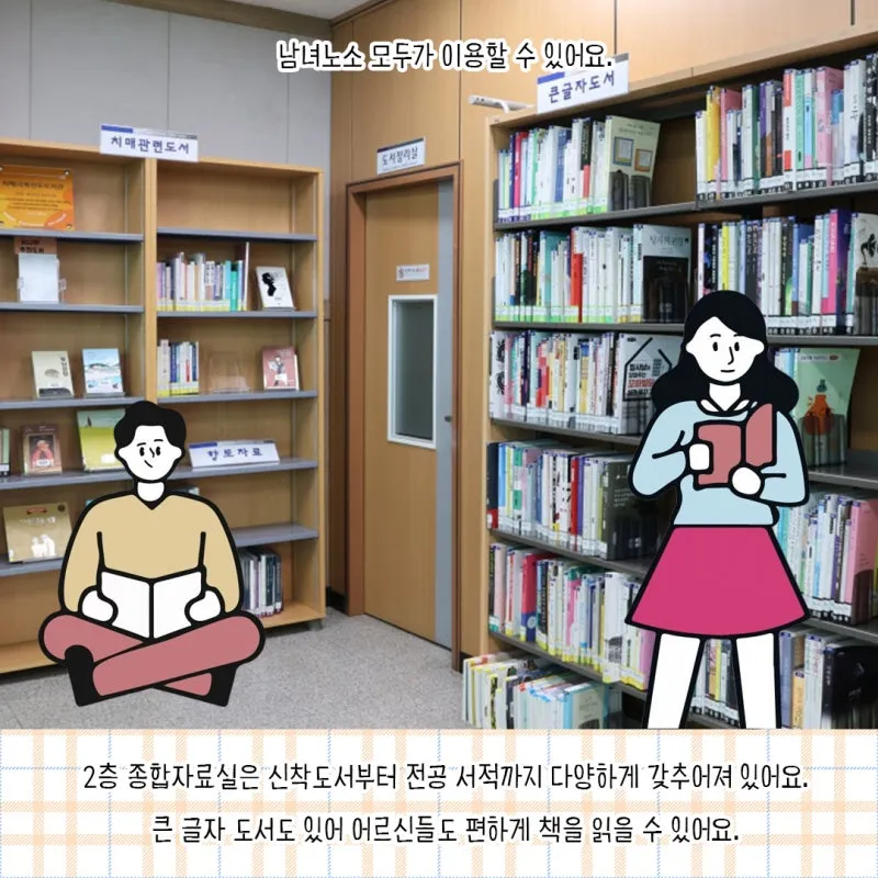 2층 종합자료실에서는 큰 글자 도서와 신간, 전공 서적을 누구나 편하게 이용할 수 있답니다.