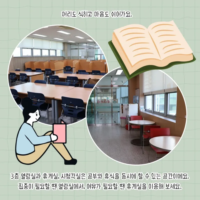 3층 열람실, 시청각실, 휴게실에서는 공부와 휴식을 함께 즐길 수 있어요.