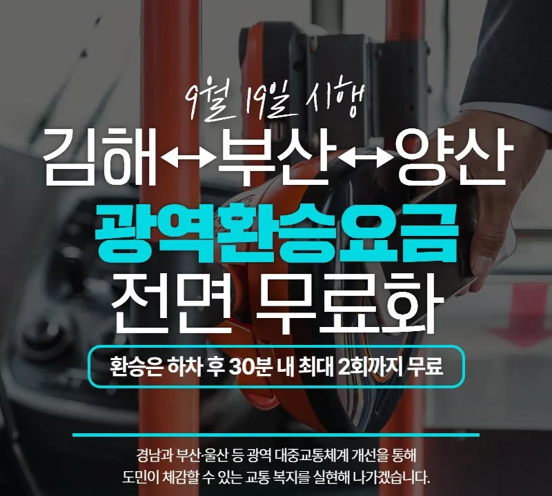 경상남도는 부산광역시와 김해↔부산↔양산 간 광역환승요금을 전면 무료화하기로 합의하고 오는 9월 19일부터 시행합니다.