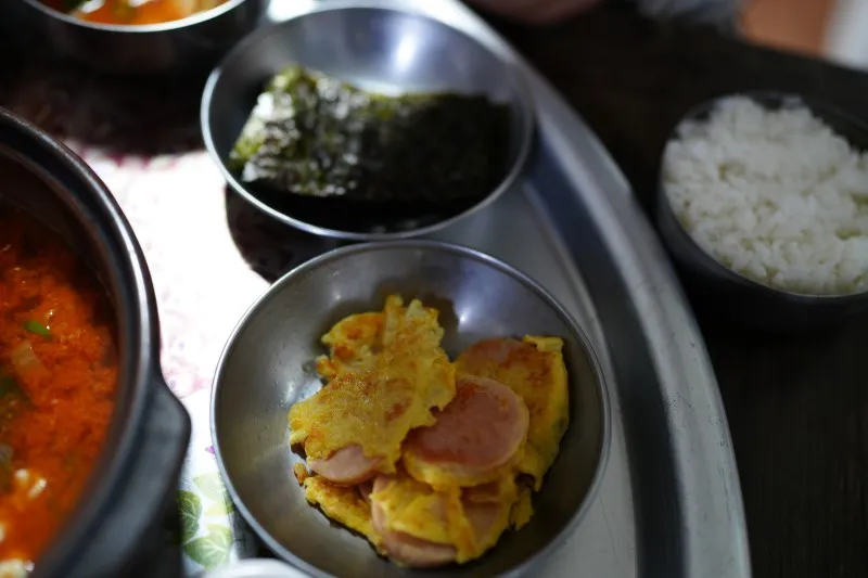 김, 소시지 전, 계란찜,