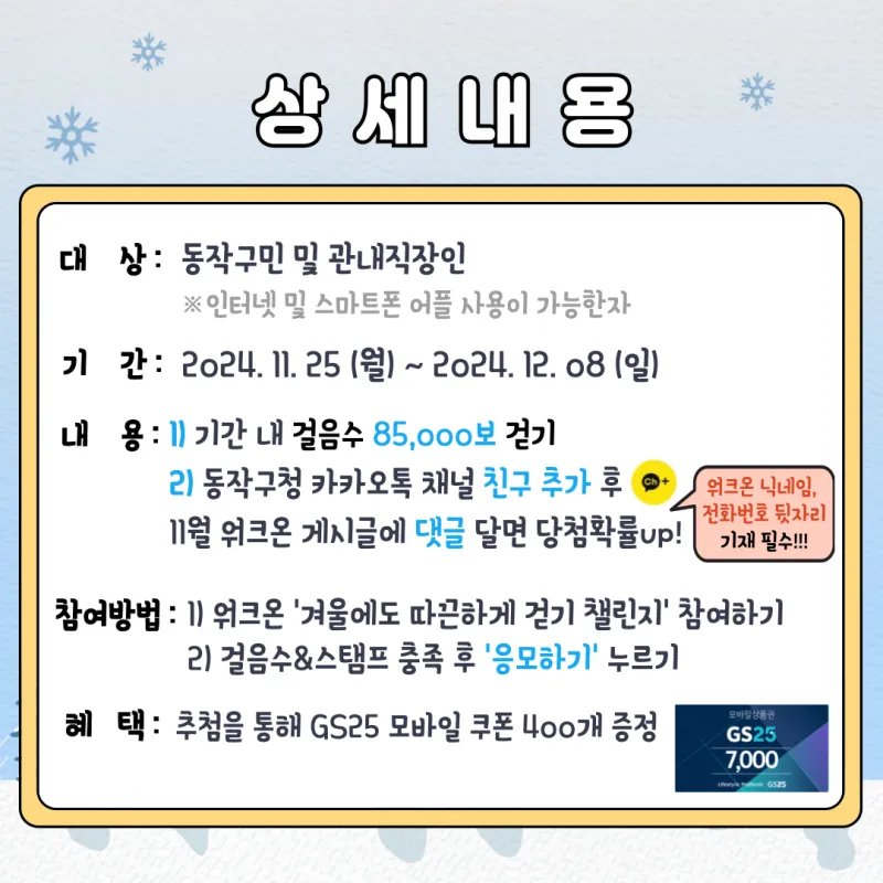 1️⃣ 기간 내 걸음 수 85,000보 걷기(하루 10,000걸음 인정) 2️⃣ 동작구청 카카오톡 채널 친구추가 후 11월 워크온 게시글에 댓글 달면 당첨확률 up! (워크온 닉네임, 전화번호 뒷자리 필수 기재) ※ 챌린지 참여를 위해서는 워크온 커뮤니티 [동작을 걷자! 지역주민] 가입이 필수입니다 |