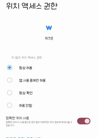 ✔ 휴대폰 앱 권한 설정에서 워크온 앱 위치권한을 "항상" 허용