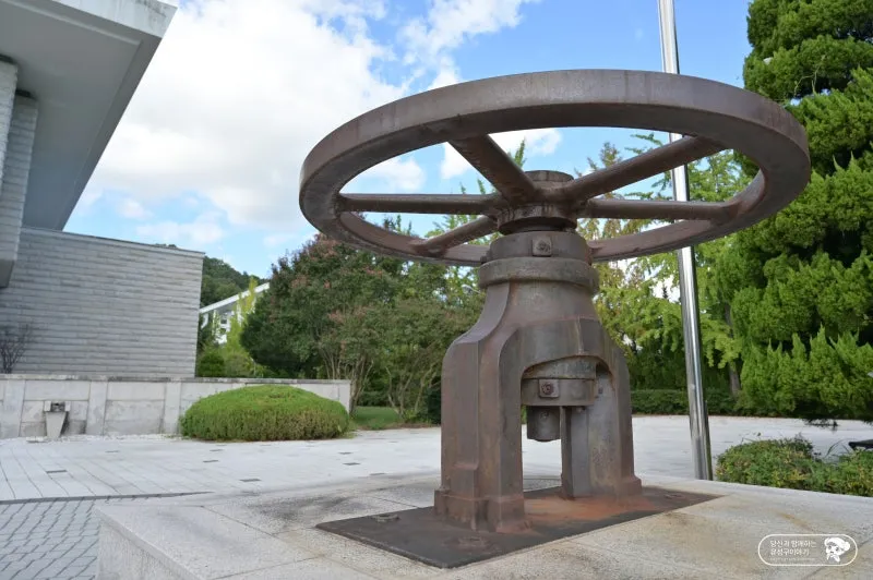 본 박물관 앞 오른편에는 커다란 조형물들이 위치하고 있는데 커다란 원형의 철물은 '압사기'로 주화의 금형으로 화폐를 제조하기 위한 틀이라고 합니다. 조선 고종 20년(1883)에 설치된 상설 조폐 기관인 전환국에서 1886년에 도입한 조폐 기기라고 합니다.