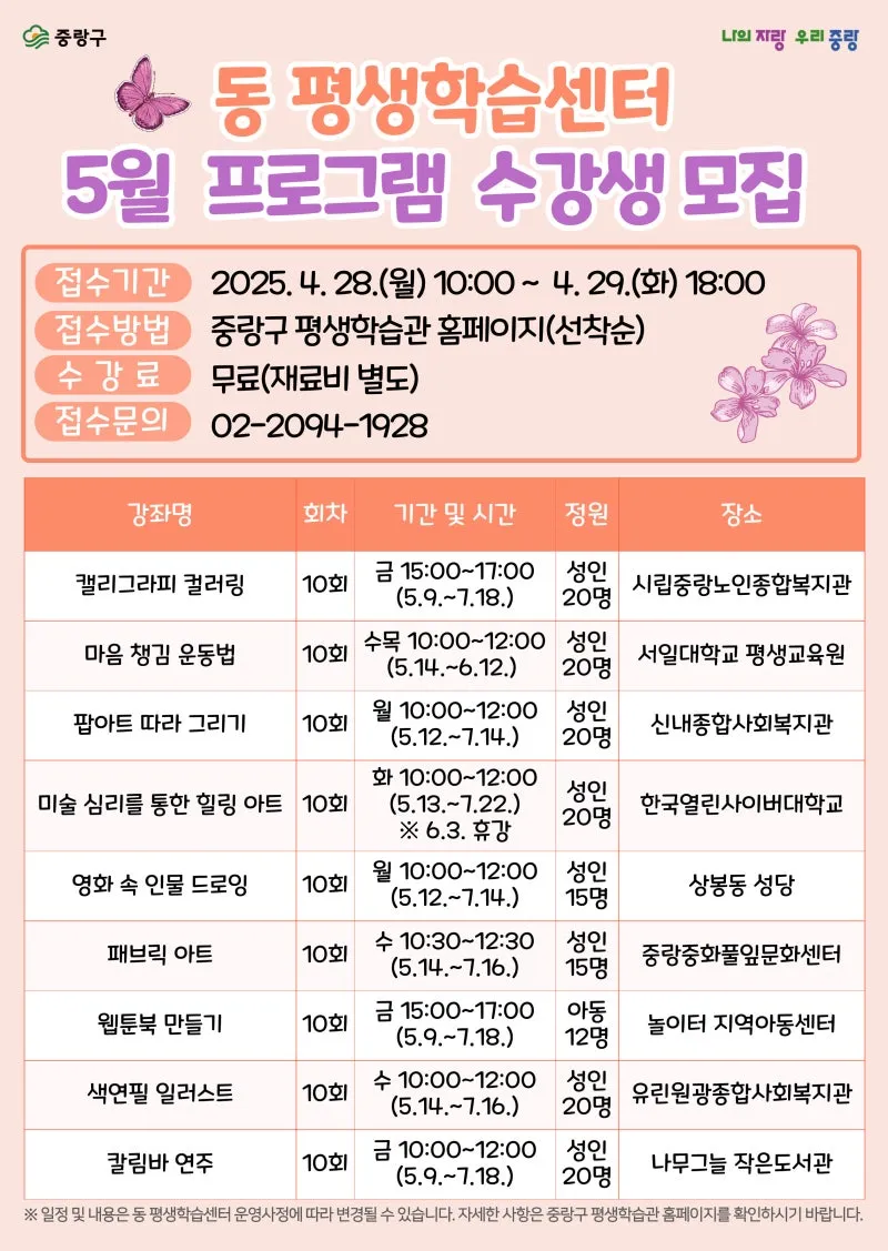 중랑구 동 평생학습센터 5월 프로그램 수강생 모집 안내