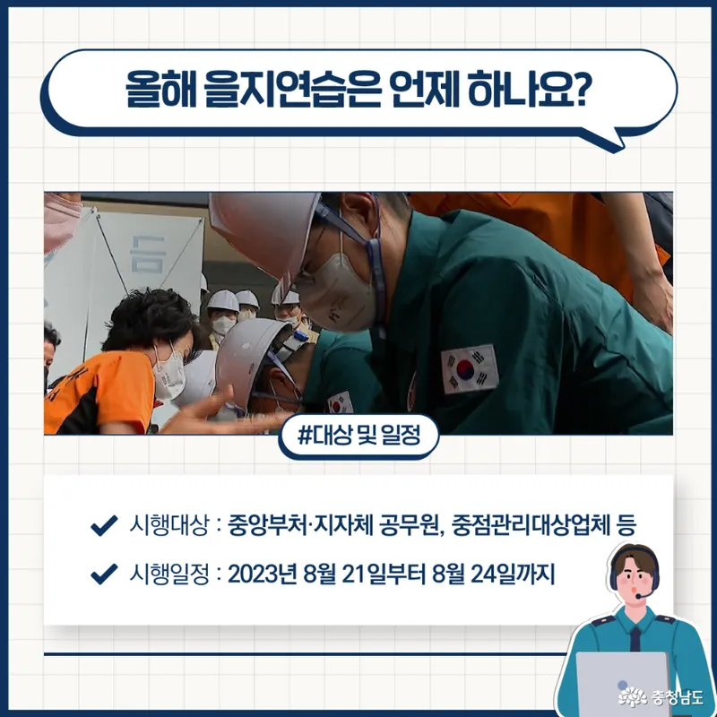 ▲ 올해 을지연습은 언제 하나요? -시행대상: 중앙부처·지자체 공무원, 중점관리대상업체 등 -시행일정: 2023년 8월 21일부터 8월 24일까지