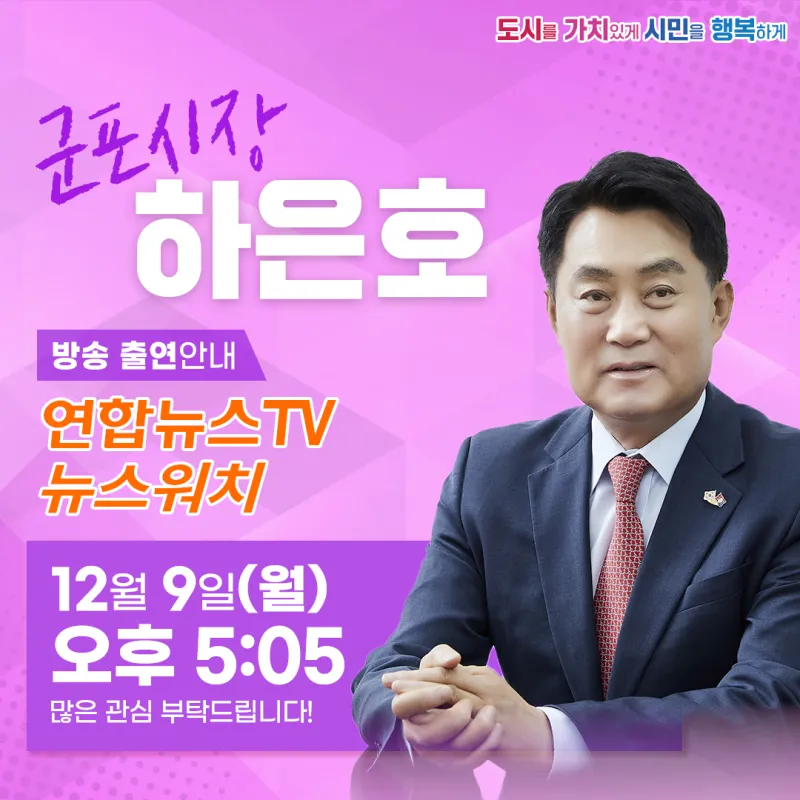 12월 9일 월요일 오후 5시 5분! 연합뉴스TV <뉴스워치> 코너에 군포시장 하은호 편이 방송됩니다.