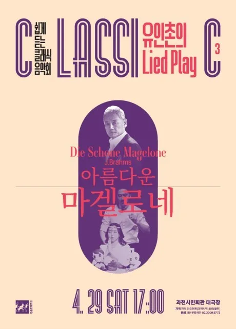 유인촌씨가 연출을 맡은 Lied Play의 마지막 공연은 브람스 탄생 190 주년을 기념하는 “아름다운 마겔로네”로 4월 29일 (토) 오후 5시에과천시민회관 대극장에서 공연됩니다. 전석 15,000원이고 과천시민들은 40% 할인됩니다.