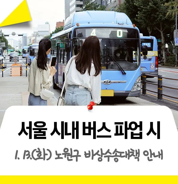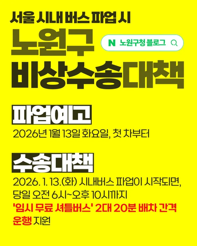 [임시 버스] 2026. 1. 13.(화) 서울 시내버스 파업(예고) 대비, 노원구 비상 수송 대책 안내! 무료 셔틀버스, 당일 06시~22시, 배차간격