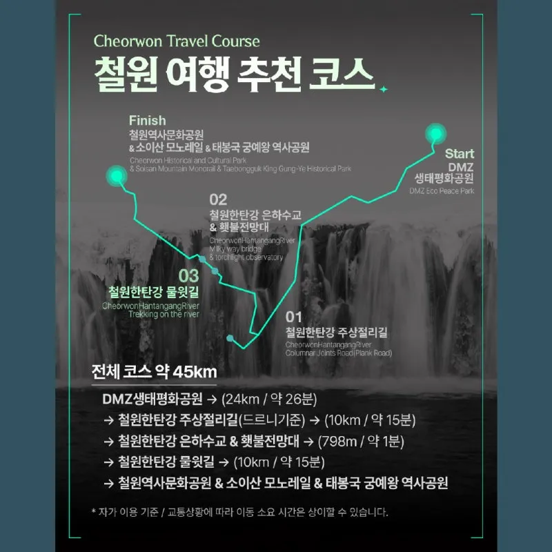 DMZ 생태평화공원 → 철원한탄강 주상절리길 → 철원한탄강 은하수교 & 횃불전망대 → 철원한탄강 물윗길 → 철원역사문화공원 & 소이산 모노레일 & 태봉국 궁예왕 역사공원