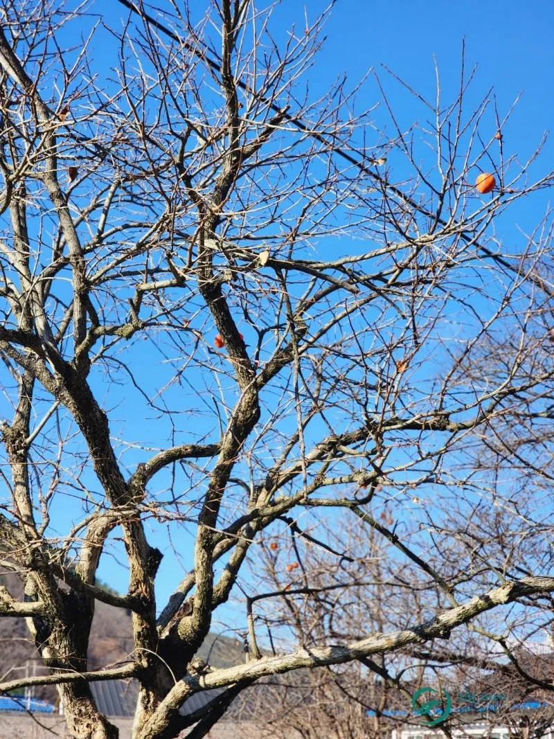 까치밥으로 남긴 감이 대롱대롱 매달려 있었어요.