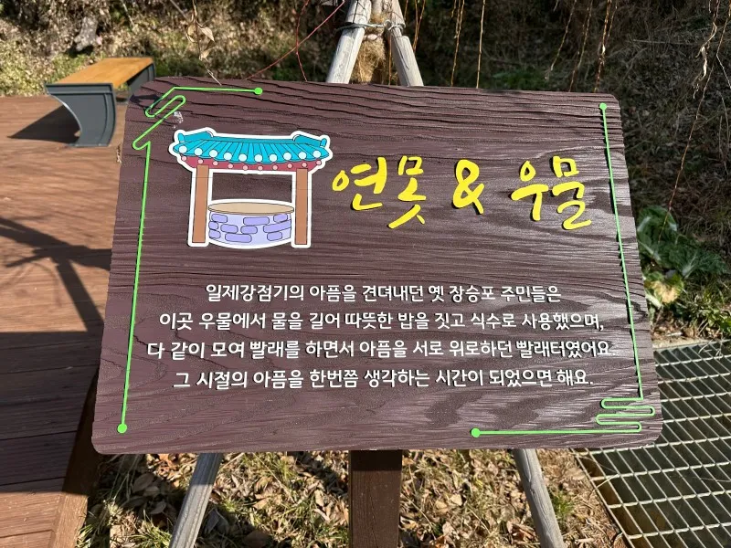 연못과 우물 자리에 도착했어요. 일제감점기의 아픔을 견뎌내던 옛 장승포 주민들이 이곳 우물에서 물을 길어서 식수로 사용했던 소중한 삶의 터전이었네요. 그곳을 멋지게 복원해 놓았어요.