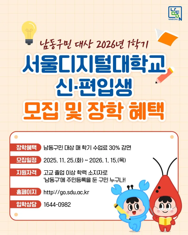 남동구민 대상 2026년 1학기 서울디지털대학교 신·편입생 모집 및 장학 혜택 안내