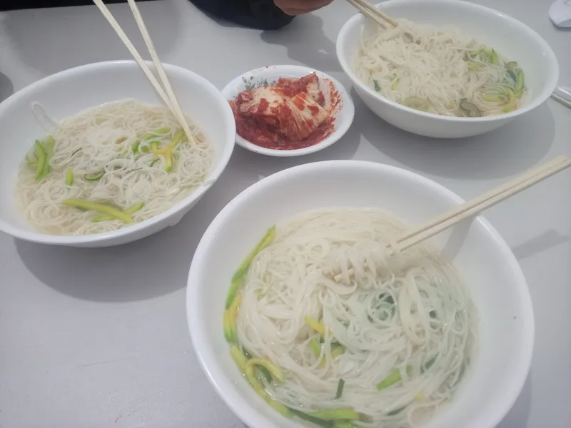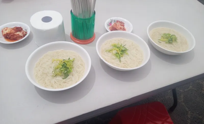 예전 시골 동네잔치에서나 볼 수 있었던 풍경인 것 같네요. 커다란 솥에 진하게 멸치 육수를 우리고, 삶아서 소쿠리에 꺼내둔 소면과 매콤한 김치를 한 접시씩 세팅해 놓고 주문하면 바로바로 테이블로 갖다주시더라고요.