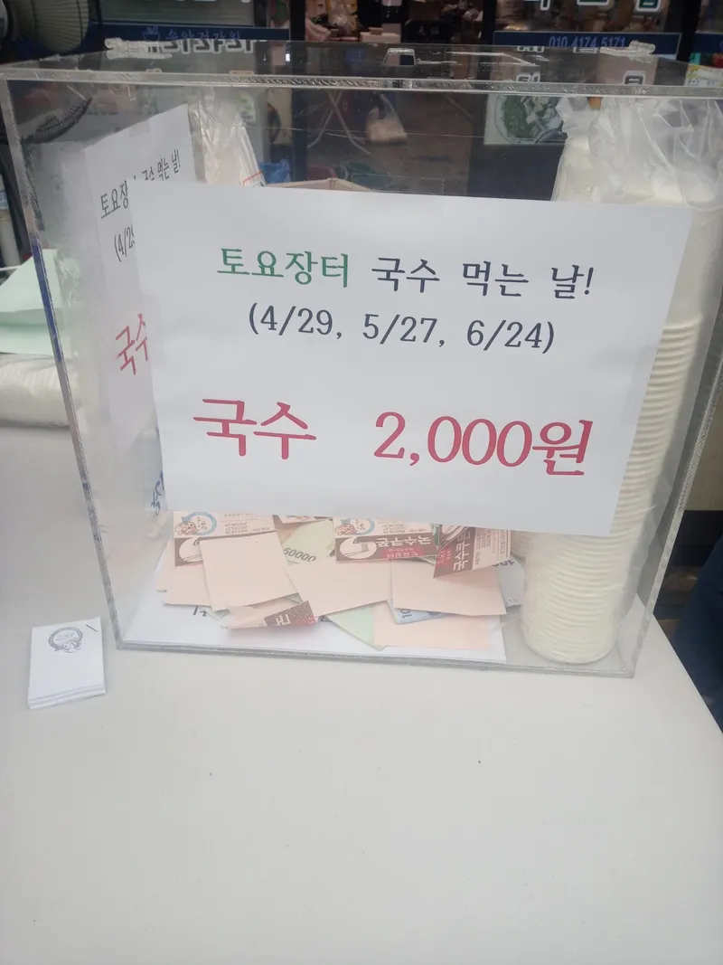 토요장터 국수 먹는 날에 오시면 단돈 2,000 원에 국수 한 그릇 맛있게 즐길 수 있답니다. (단, 현금으로 준비해 주세요!)