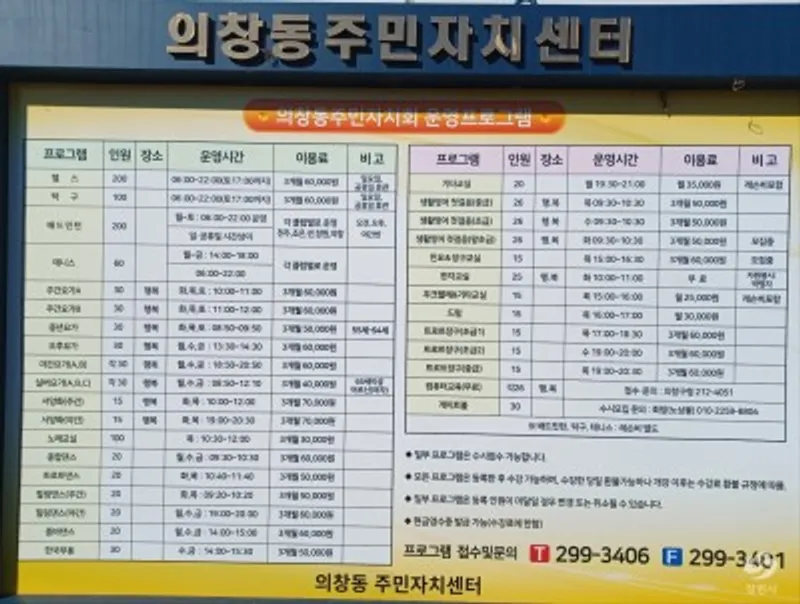 창원시 의창구 의창동주민자치센터는 천주산 자락에 위치하여 야외운동장과 다목적 실내체육관은 맞춤형 강좌(체육,교양,음악)를 개설하여 지역 주민들의 체력단련과 취미 활동을 지원하기위해 다양한 프로그램을 제공하고 있다.