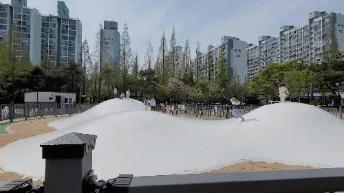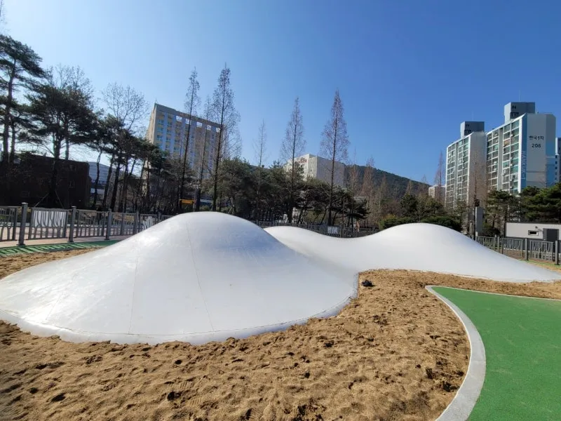 이색 놀이 공간이 자리 잡고 있는데요, 이것은 지난달 개장한 어린이 뜀동산 입니다.