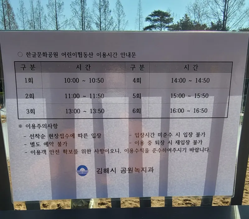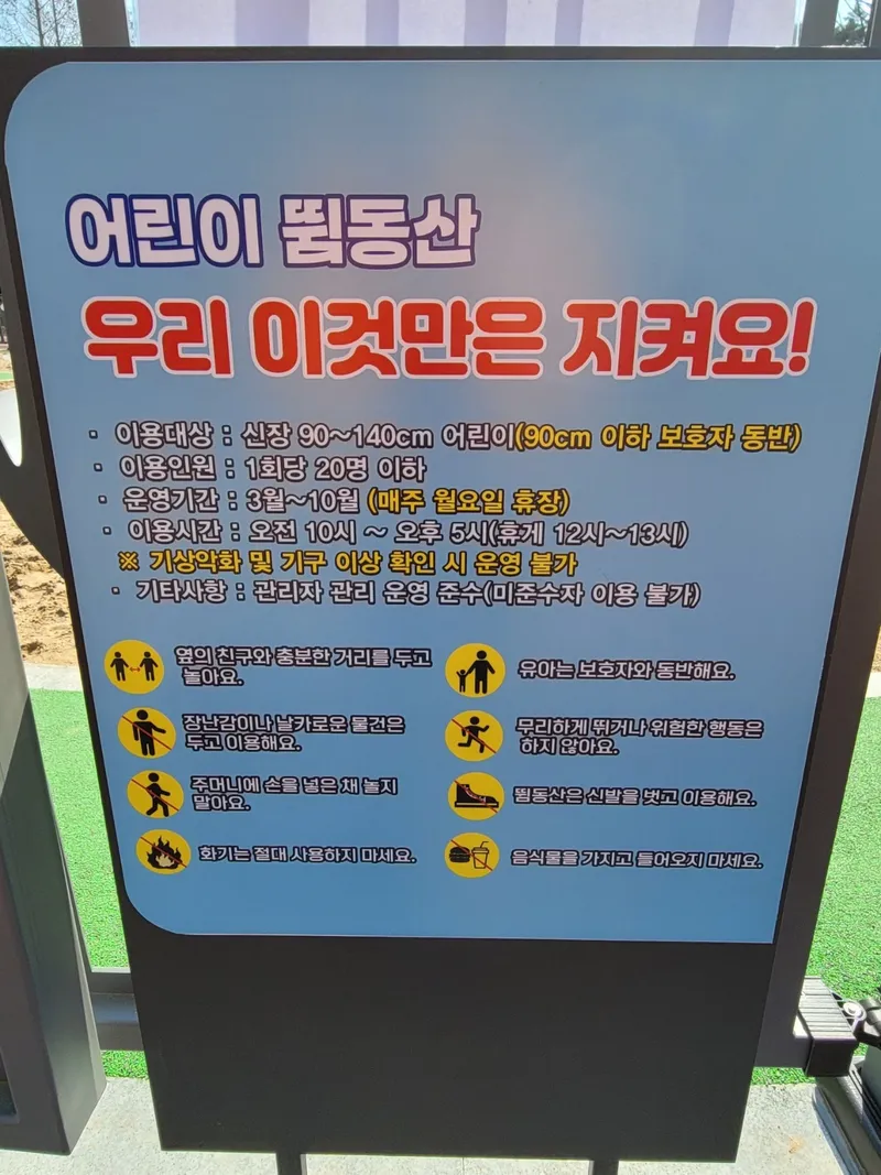 하루 6회 운영이 되며 매시간마다 어린이 뜀동산 관리원이 명부를 작성하고 20명 이하의 어린이만 이용이 가능합니다.