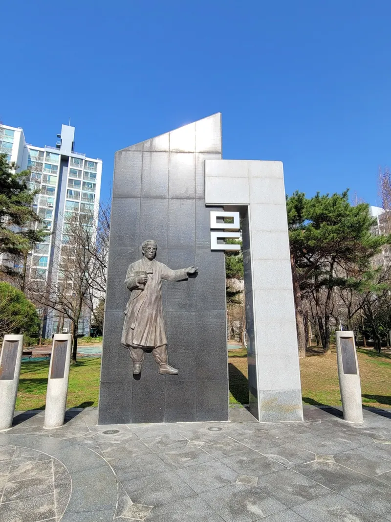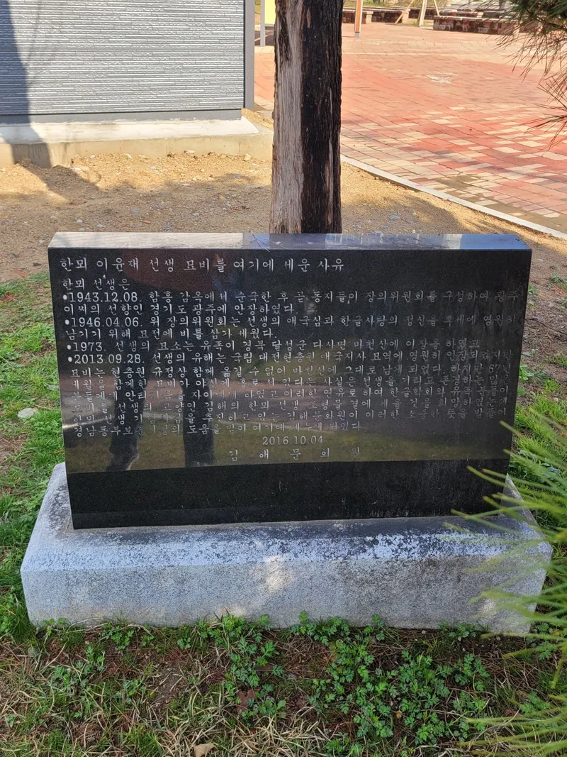 한바탕 신나게 뛰고 한숨 돌리며 산책을 하다 보면 한뫼 이윤재 선생님의 업적을 기리는 조형물과 묘비를 볼 수 있습니다.