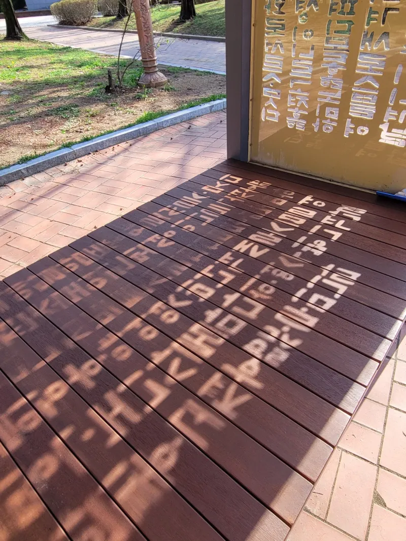 훈민정음 조형물이 햇볕을 받아 정자에 아로새겨진 모습도 아름다운 작품처럼 느껴집니다.