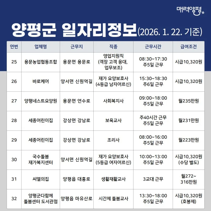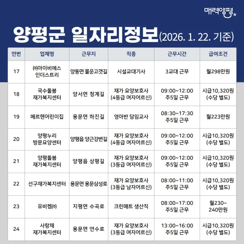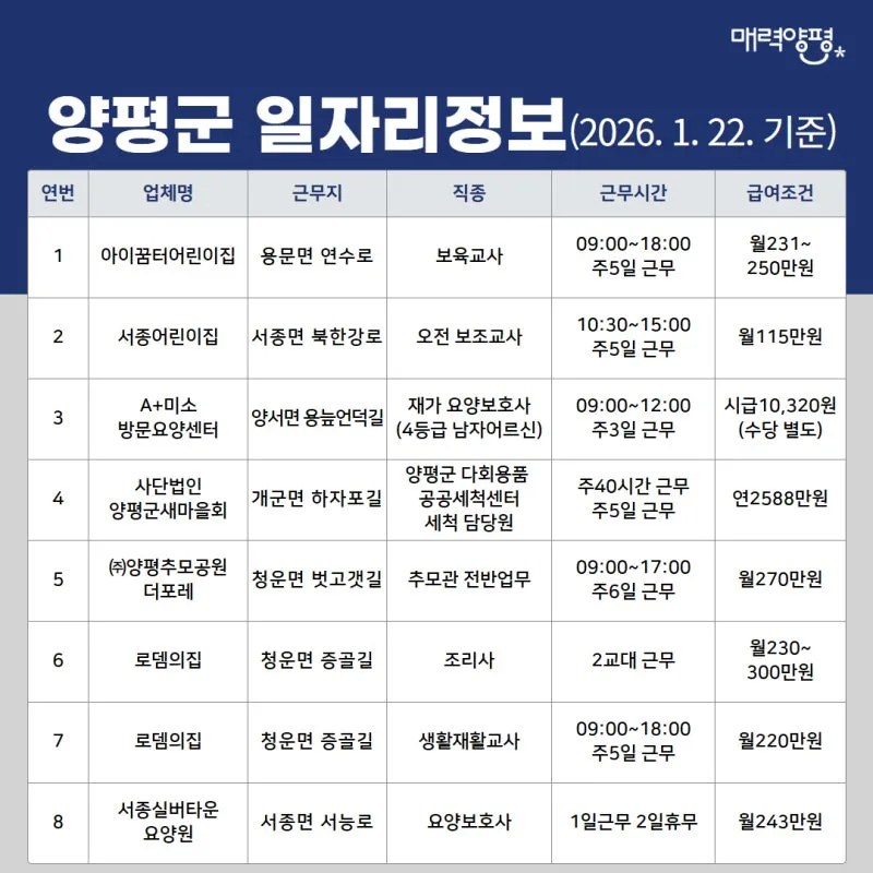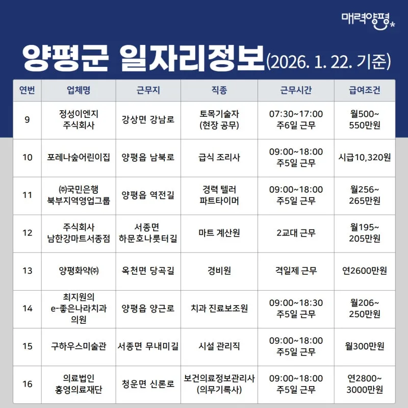 양평군 일자리정보('26. 1. 22. 기준)