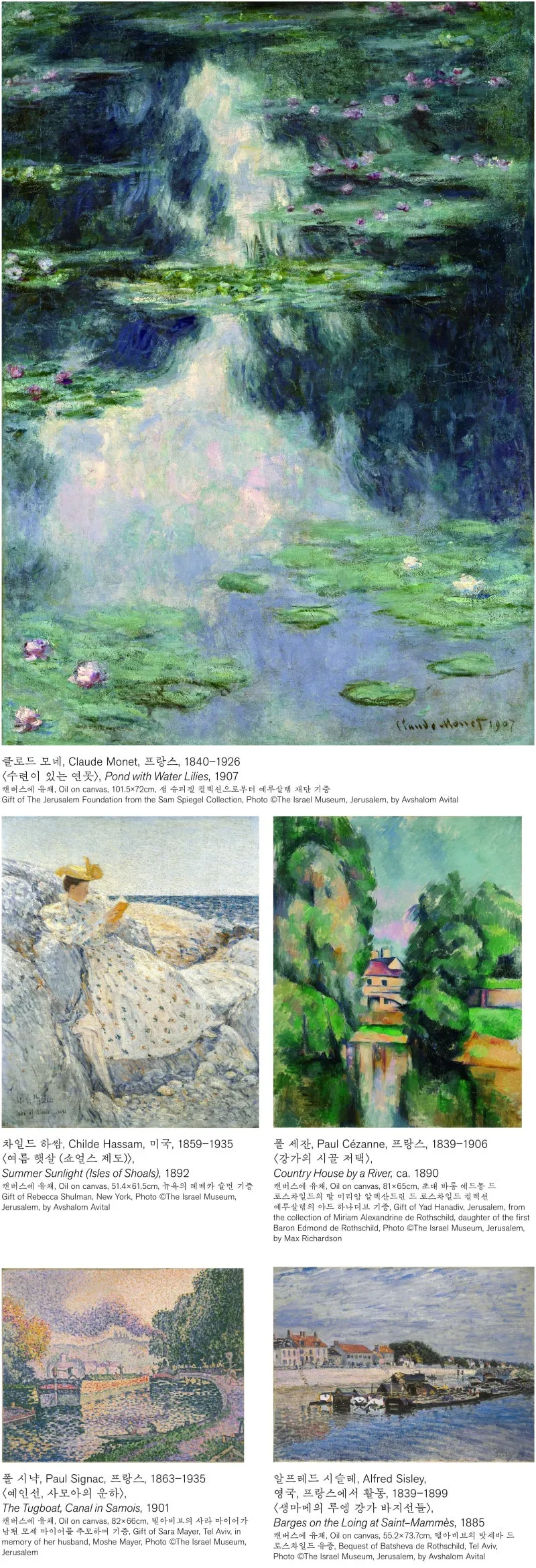 햇살이 반짝이는 수련의 연못, 안갯속 들판의 새벽 공기, 꽃과 여인이 머무는 찰나의 색채 그리고 세잔의 고요한 강가의 집.