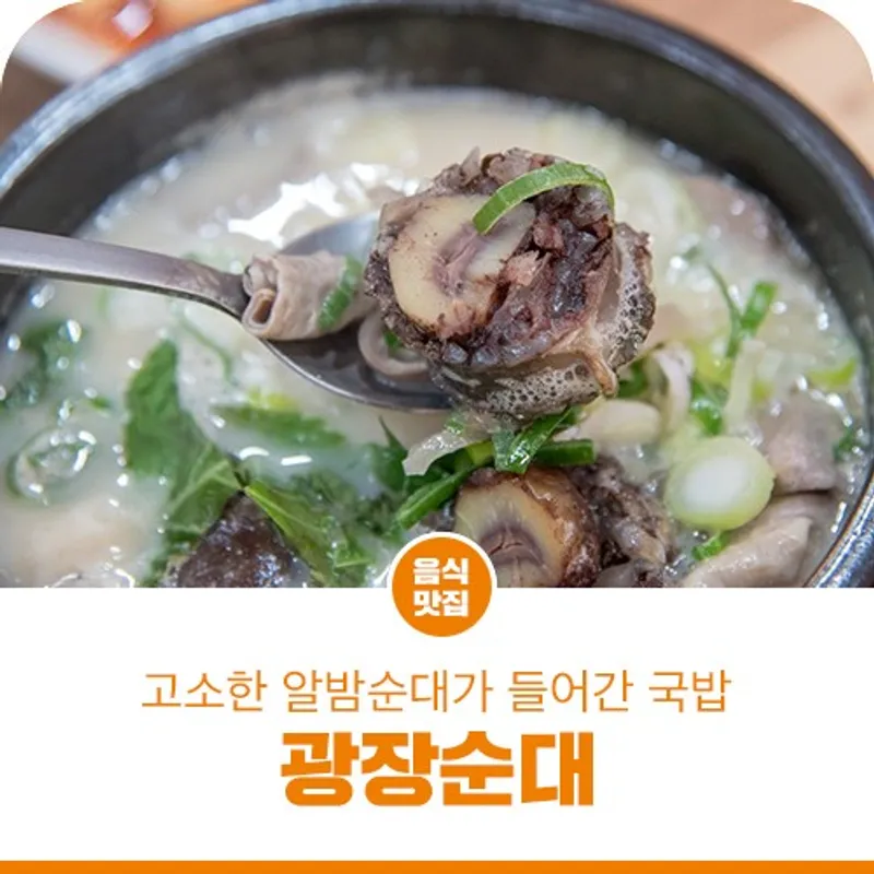 으뜸공주맛집 광장순대의 메인 메뉴는 모듬순대국밥과 머릿고기국밥입니다. 순대만 들어간 국밥도 가능하고요. 모든 메뉴는 다 포장도 가능합니다.광장순대가 유명한 이유는, 바로 공주알밤을 넣은 찹쌀 순대를 사용하기 때문입니다. 사골뼈, 돼지고기, 무, 밤, 파, 깻잎 등 고춧가루 일부를 제외하고는 모든 재료를 다 국내산만 사용하고 있습니다. 그래서, 안심하고 드실 수 있는 안심식당이기도 합니다.