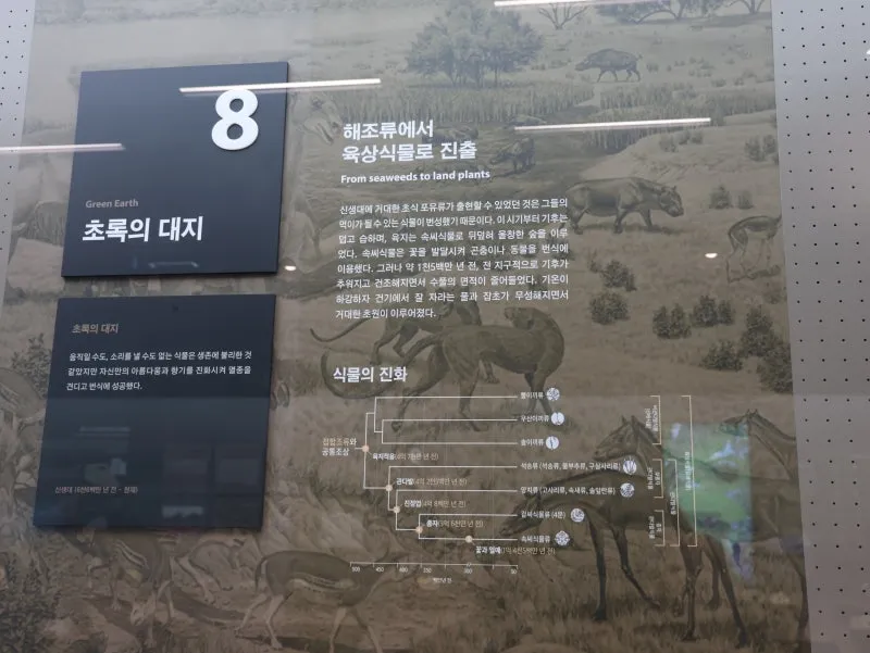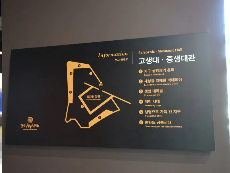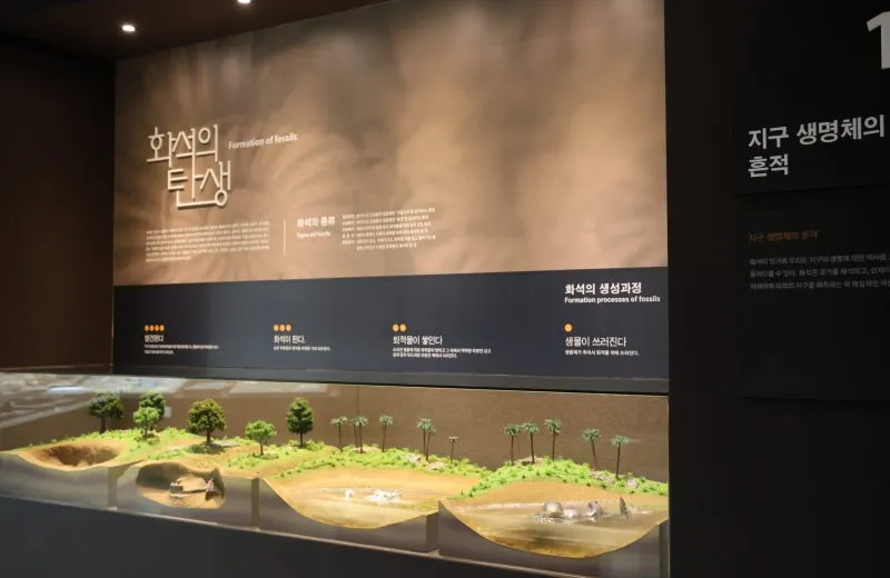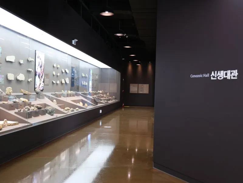 전시실은 고생대, 중생대, 신생대 순서로 구성하여 화석을 통해 각 시대에 어떤 생물들이 존재하였는지, 그 시대의 환경은 어떠했는지 알 수 있도록 최신식 시설로 이루어져 있답니다.