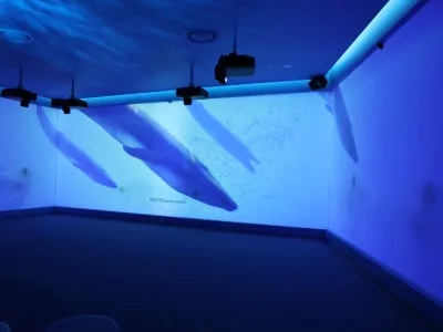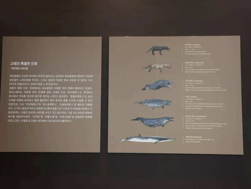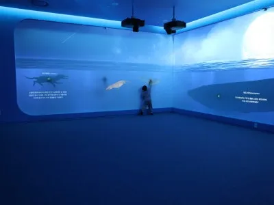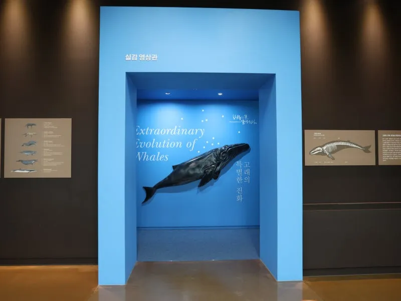 신생대관 내의 실감영상관에서는 대형 인터랙티브 영상을 통하여 육지에 살던 고래의 조상이 바다로 돌아가는 진화의 과정을 경험할 수 있어요.
