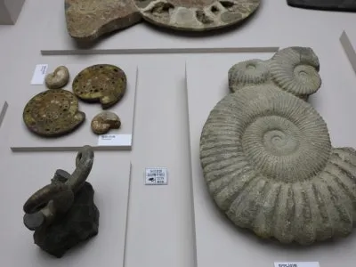 성게, 불가사리, 물고기 등 다양한 해양생물들과 원시코뿔소와 원시 말의 두개골, 스테고돈의 아래턱까지 다양한 화석들이 있어요.