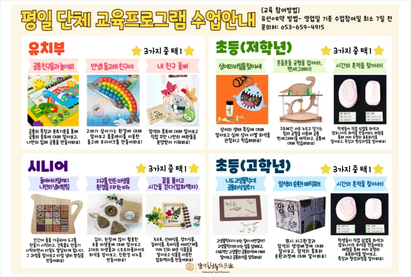 달성화석박물관 홈페이지에서 이달의 프로그램과 평일 단체 교육 프로그램 수업 확인할 수 있으며,
