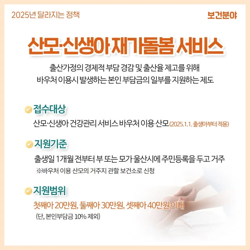 ○ 지원대상 : 산모·신생아 건강관리 서비스 바우처 이용 산모(2025.1.1. 출생아부터 적용)