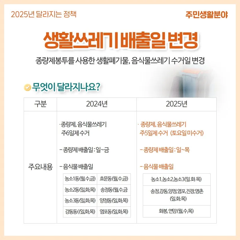· 종량제, 음식물쓰레기 주5일제 수거(토요일 미수거) - 종량제 배출일 : 일~목 - 음식물 배출일 농소1,농소2,농소3(일․화․목) 송정,강동,양정,염포,진장,명촌 (일.화.목) 화봉, 연암(월,수,목) |