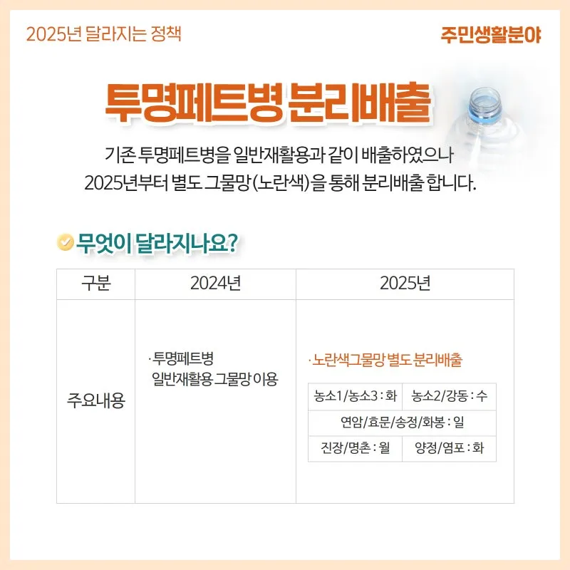 - 기존 투명페트병을 일반재활용과 같이 배출하였으나 2025년부터 별도 그물망(노란색)을 통해 분리배출 변경