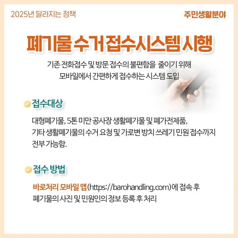 기타 생활폐기물의 수거 요청 및 가로변 방치 쓰레기 민원 접수까지 전부 가능함.