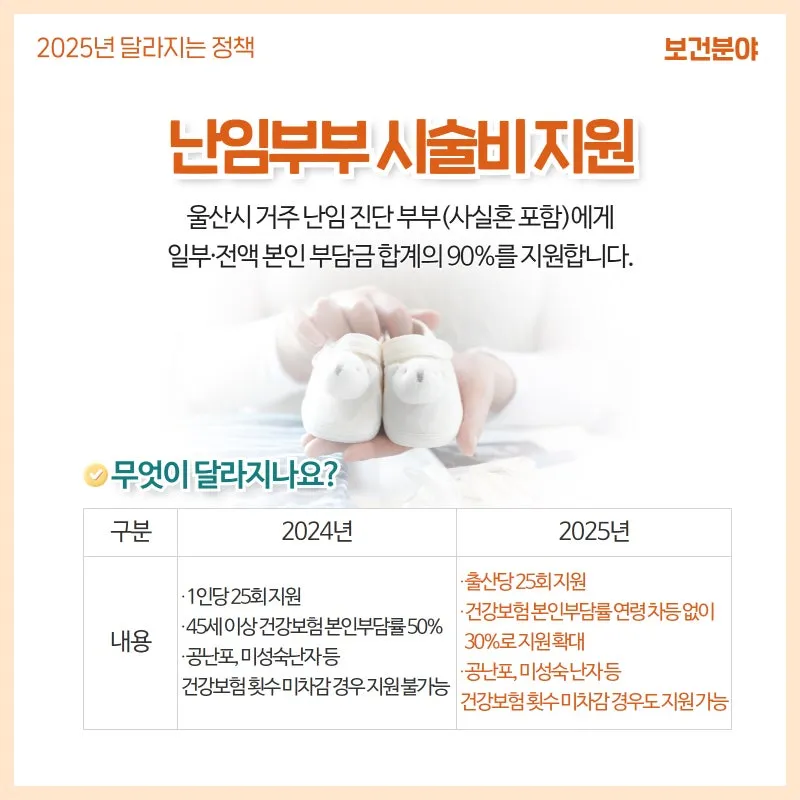 · 1인당 25회 지원 · 45세 이상 건강보험 본인부담률 50% · 공난포, 미성숙난자 등 건강보험 횟수 미차감 경우 지원 불가능 |