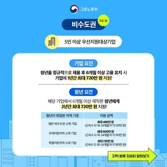 내년(2026년)부터는 청년들이 지방에서 취업·성장할 수 있도록 지원이 강화된 <비수도권 청년일자리도약장려금>이 신설됩니다. 비수도권 청년일자리도약장려금은 청년이 취업한 지역을 기준으로 일반 비수도권 소재 기업은 최대 480만 원, 우대지원지역 소재 기업에 취업한 청년에게는 최대 600만 원, 특별지원지역 소재 기업에 취업한 청년에게는 최대 720만 원의 지원금을 지급합니다.