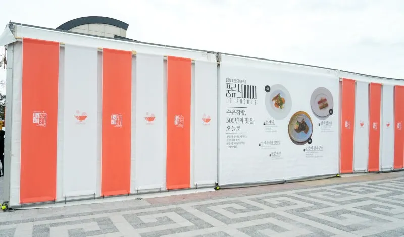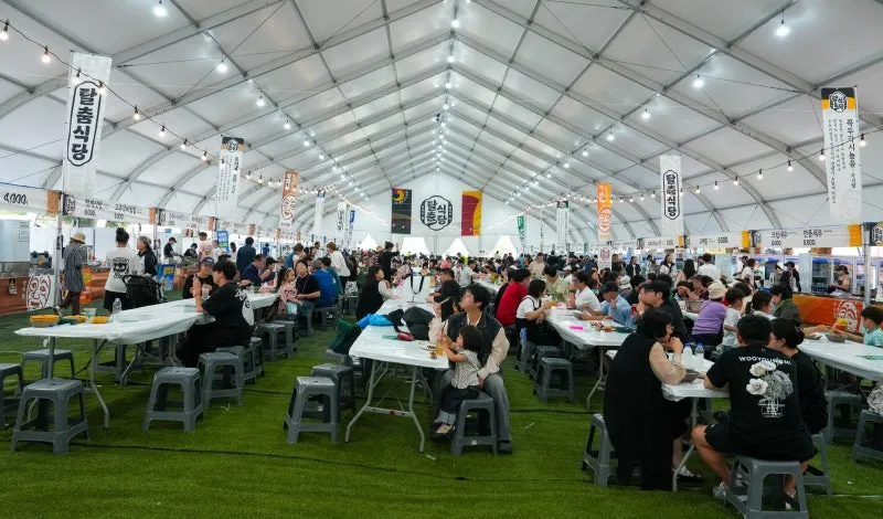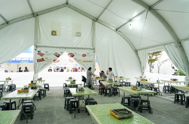 넓은 천막 아래 수백 명이 동시에 식사를 즐길 수
