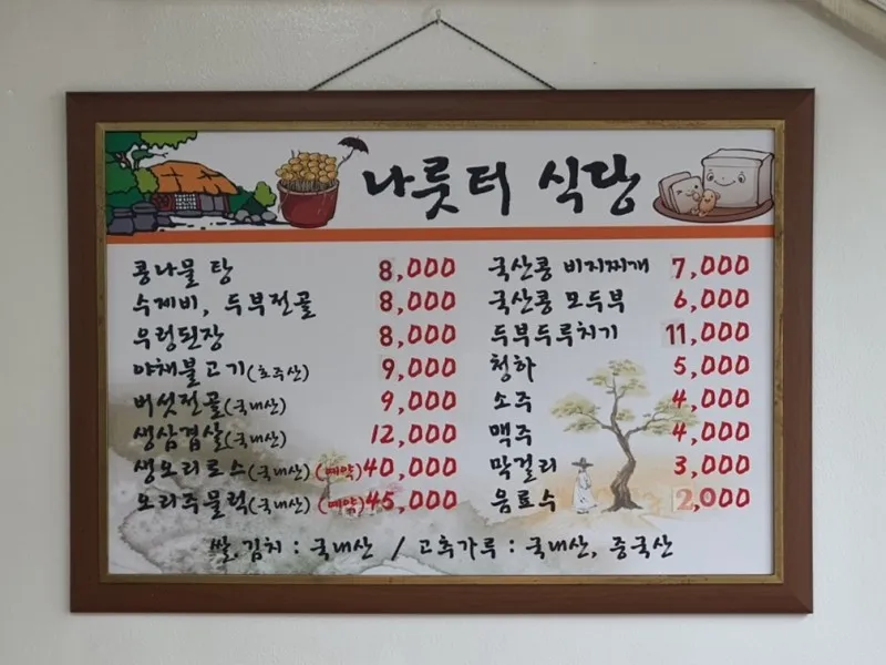 나룻터식당은 직접 만드는 국산콩 모두부와 두부 두루치기, 국산콩 비지찌개 뿐만 아니라 수제비, 우렁된장, 야채불고기 맛집입니다. 1만 원 이내의 식사를 찾기 어려운 요즘, 7~8천 원으로도 든든하게 한 끼를 해결할 수 있어요. 그 뿐이게요?
